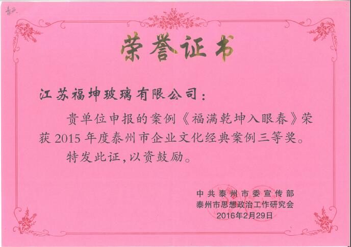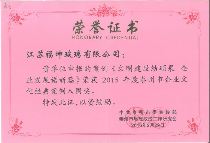 | 7月17日,我司行政部撰写的企业文化建设案例《文明建设结硕果 企业发展谱新篇》荣获2015年度泰州市企业文化建设经典案例入围奖;