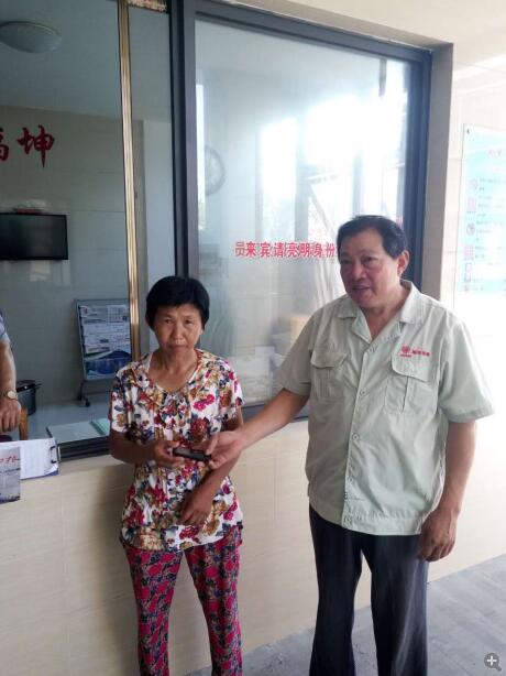 图为封先生爱人在918博天堂玻璃厂门口从吉国达手中接过手机。