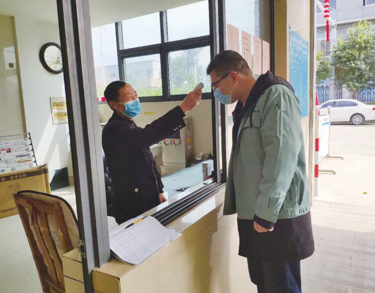 3月13日,918博天堂玻璃门卫室。“请问您找谁?有什么事?”,“我找采购部某某”,在得到来人的回答后,门卫人员积极引导来客进行体温测量和信息登记。