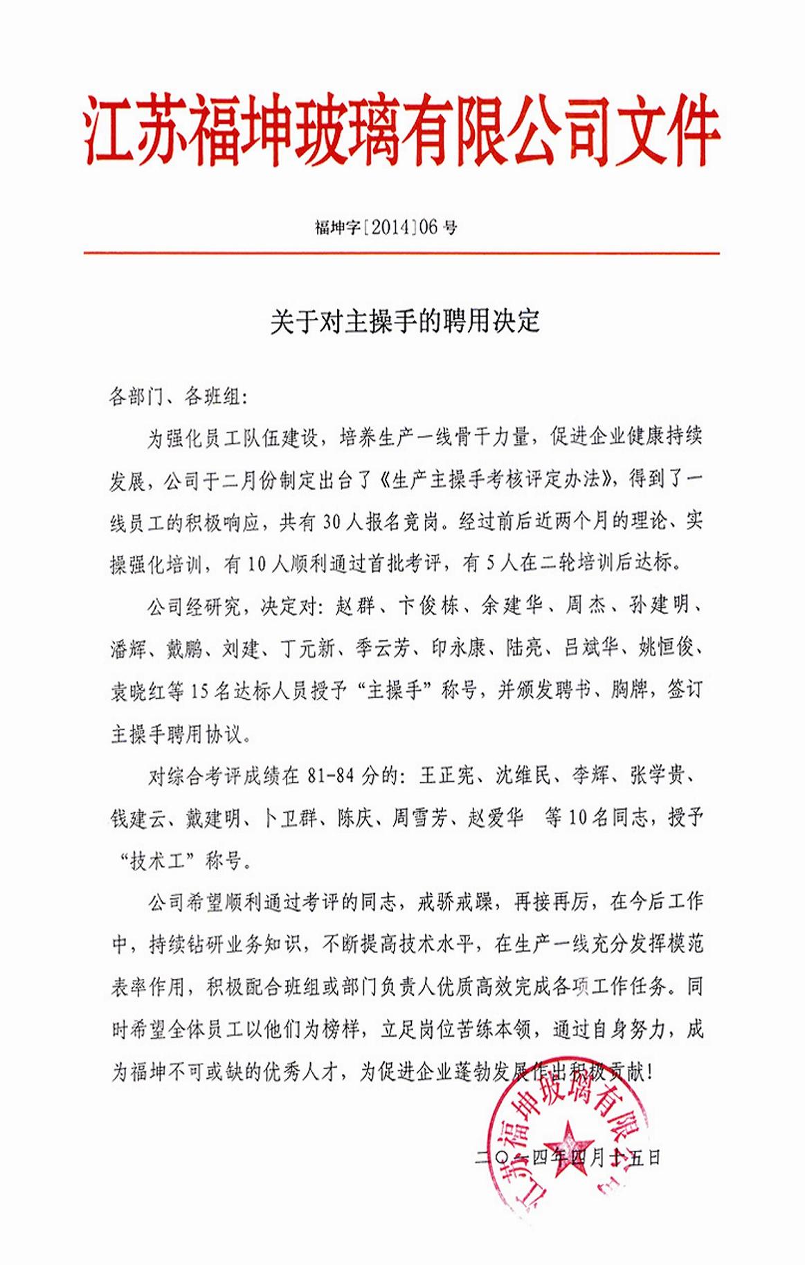 主操手聘用决定