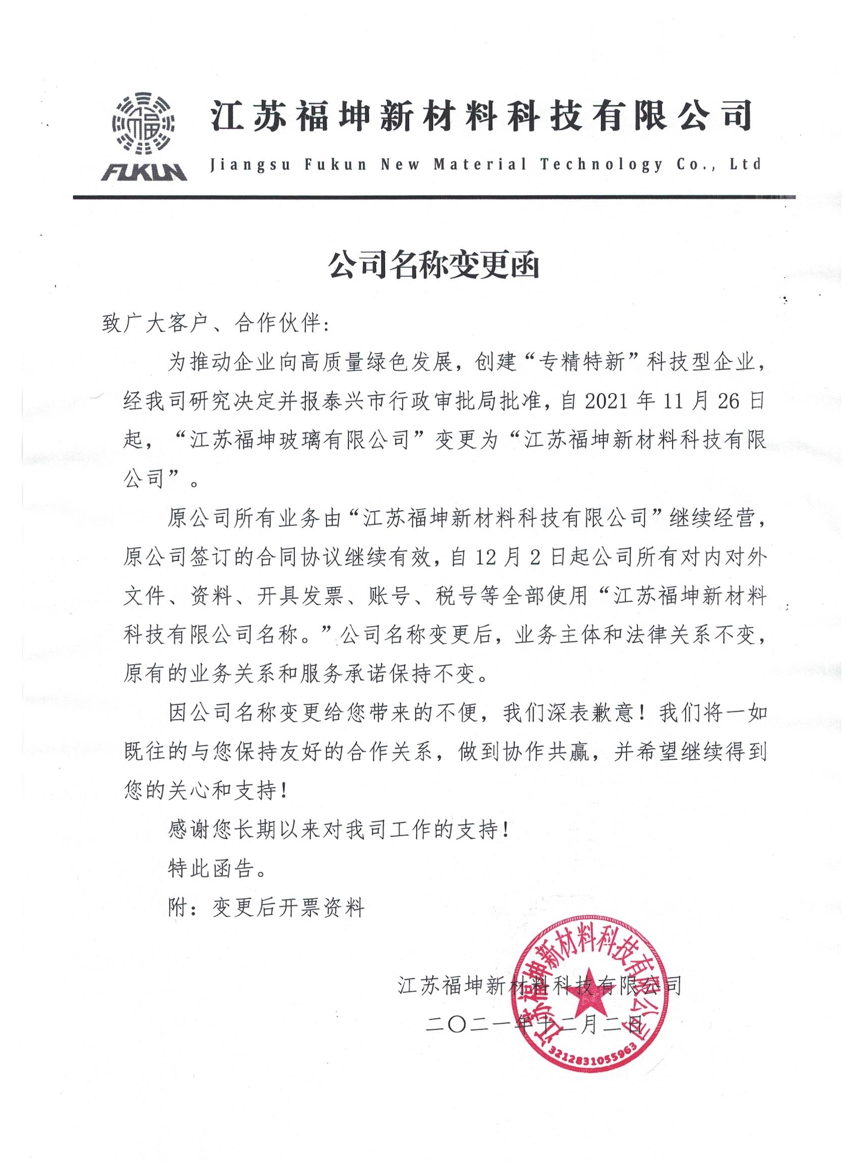 致广大客户、合作伙伴: 为推动企业向高质量绿色发展,创建“专精特新”科技型企业,经我司研究决定并报泰兴市行政审批局批准,自2021年11月26日起,“江苏918博天堂玻璃有限公司”变更为“918博天堂·(中国区)官方网站 ”。 原公司所有业务由“918博天堂·(中国区)官方网站 ”继续经营,原公司签订的合同协议继续有效,自12月2日起公司所有对内对外文件、资料、开具发票、账号、税号等全部使用“918博天堂·(中国区)官方网站 名称。”公司名称变更后,业务主体和法律关系不变,原有的业务关系和服务承诺保持不变。 因公司名称变更给您带来的不便,我们深表歉意!我们将一如既往的与您保持友好的合作关系,做到协作共赢,并希望继续得到您的关心和支持! 感谢您长期以来对我司工作的支持! 特此函告。 附:变更后开票资料